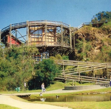 Universidade Livre do Meio Ambiente criada em 1996 em uma pedreira desativada. Passarelas suspensas conduzem à mata, com estruturas de madeira integradas à paisagem.